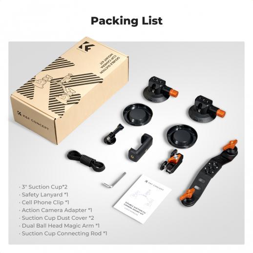 3" sugekopmonteringssæt til kamera med 360° kuglehoved. Kraftigt kameramonteringssæt til bilforrude, motorhjelm og sidepanel. Kompatibel med GoPro, DJI, Insta360, DSLR-kameraer og telefoner. K&F CONCEPT.