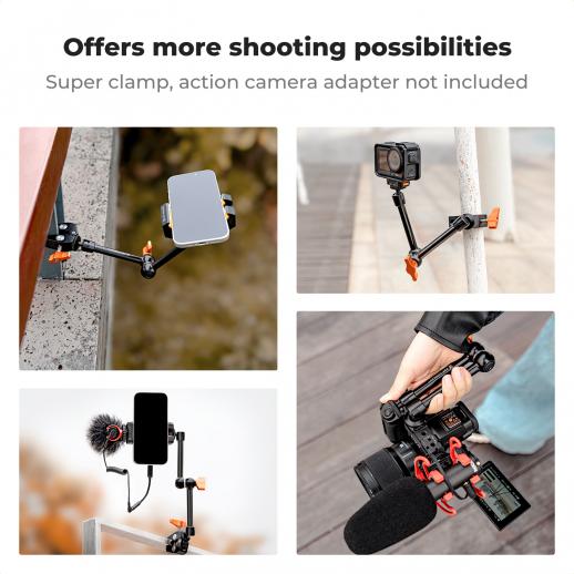 - * 【Kompatible enheder】- Begge ender af den magiske arm har 6 mm skruer, der muliggør fastgørelse af kameraholdere, blitz, mikrofoner, webkameraer, skærme, DSLR-kameraer, smartphones og actionkameraer. Kompatibel med GoPro/DJI/Insta360-enheder. *Telefonholder/klemme/kameraadaptere medfølger ikke.