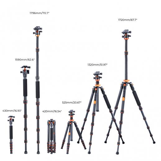 - * 【Fleksibel optagelse】K&F Concept D255C4+BH-28L kulfiberstativer fås i en række forskellige optagestile. Det specialdesignede kuglehoved kan rotere 360°, og inverteret optagelse giver dig mulighed for at optage statiske landskaber fra en lav vinkel for at opnå en fantastisk optageoplevelse.