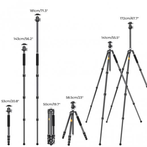 K&F Concept X-Serie 68" / 172cm Kulstof Fiber Kamerastativ med 30mm Metal Kuglehoved, Professionelt Fotostativ 12KG Belastning til DSLR, Video, Landskabs- og Rejsefotografering X254C4+BH-30