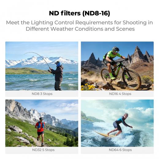 - * [Præcis eksponeringskontrol]: ND8 ND16 ND32 ND64-filteret reducerer eksponeringen med 3 trin til 6 trin, hvilket er ideelt til forskellige stærke sollysforhold, samtidig med at det forbedrer billeddetaljer naturligt. Det reducerer ensartet mængden af lys, der kommer ind i actionkameraet under dynamiske udendørsaktiviteter, for at forhindre overeksponering og opnå bevægelsessløreffekt.