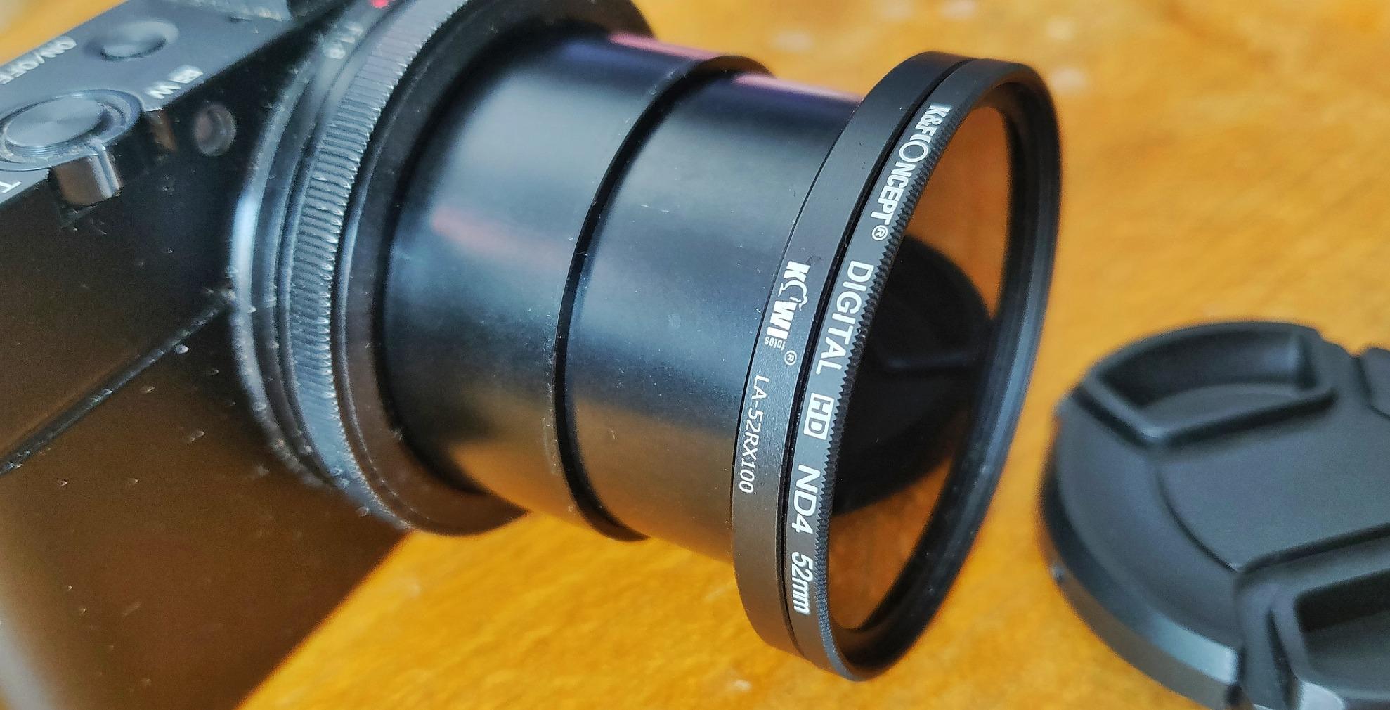 Linsefilter 52MM, K &F Concept 52mm slankt UV-filter 52MM CPL-filter ND Grad-filter Cirkulært polariserende filter Neutrale densitetsfiltre + kronbladsmodblænde + Center Pinch Lens Cap + rengøringspenKøbte dette hovedsageligt til ND-filteret. Planen var at bruge den på min Sony RX100 M2/II ved hjælp af en tredjeparts klæbende linseringadapter, som jeg også fik fra Amazon. Med adapteren tilsluttet kameraet fungerede alle filtre fint. Det samme gjorde objektivdækslet og modlysblænden. Et lille minus er, at modlysblænden var synlig i skudt med kameraet i vidvinkeltilstand. Fast ved at zoome ind nogensinde så lidt, men til sidst tog jeg modlysblænden helt af. Foto: ND-filter monteret på min Sony RX100 M2 ved hjælp af Kiwifotos 52mm Lens Filter Adapter. Kiwifotos 52mm linsefilteradapterring til Sony Cyber-shot DSC-RX100