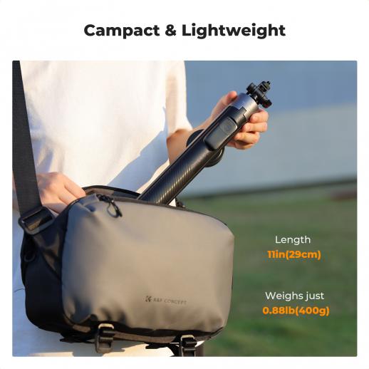 - * Pop Open Quick Fold: Dette stativ til iPhone har pop op-funktion og løft-lukning for hurtig og bekvem betjening. Derudover kan K&F CONCEPT telefonstativ forlænges op til 180 cm og foldes ned til kun 29 cm. Med en vægt på kun 400 g er det nemt at pakke væk og tage med dig overalt.