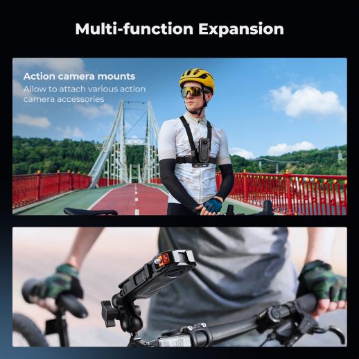 - * [Flere monteringspunkter]: Der er to cold shoe-beslag ovenpå og på siden af kameraburet, som kan bruges til at installere tilbehør såsom mikrofoner og LED-videolamper. Tre 1/4" skrueholdere er kompatible med de fleste stativer, kuglehoveder, superklemmer, selfie-sticks og andet tilbehør, så du nemt kan tilslutte dit kamera til forskellige enheder og frit skifte til vandret eller lodret tilstand. Actionkamerabeslaget i bunden kan foldes sammen for at opbevare det, hvilket kan tilsluttes de