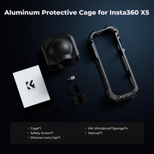 - * [Til Insta360 X5]: K&F Concept Standard aluminiumsbur er kompatibelt med mikrofoner og LED-lys, hvilket giver en perfekt løsning til vlogoptagelse. Det understøtter udskiftning af objektiv og batterier, samtidig med at det har adgang til kameraets strømforsyning, betjening og opladningsporte.