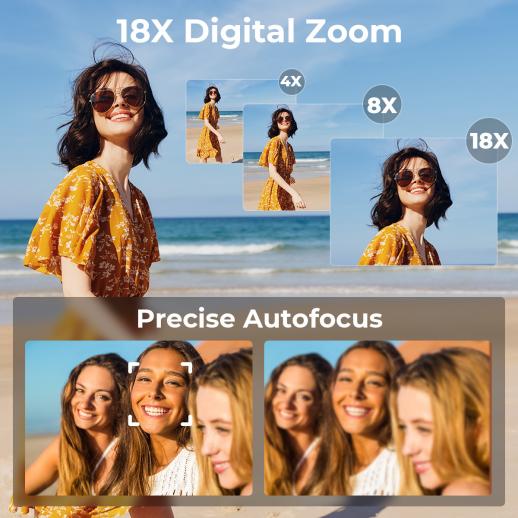 Fra fjerne landskaber til spændende begivenheder sikrer denne funktion, at du aldrig går glip af en detalje. Uanset om du er en rejsende, en naturelsker eller bare fanger livs dyrebare øjeblikke, gør 18X digital zoom det utilgængelige til bemærkelsesværdigt.