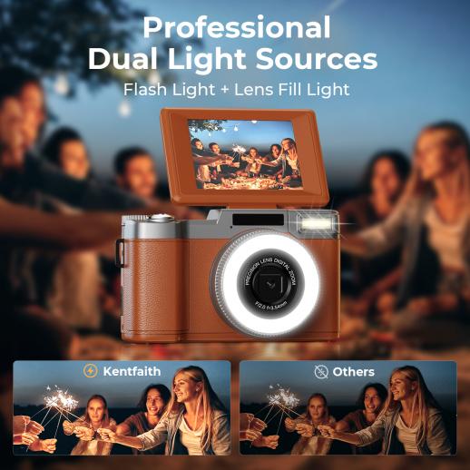 - * 2 lyskilder, uendelige muligheder Med dobbelt belysningsfunktion udstyrer dette 4K digitale kamera dig til ethvert scenario med lavt lys. Du kan bruge det kraftige blink til at lyse dimme miljøer, såsom en aftenkoncert, fest eller campingplads. I mellemtiden udsender linsefyldeligtet en stabil, naturlig glød, der er perfekt til videoer, vlogs, live streaming osv.