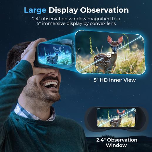 - * 2,4" skærm, 5" udsigt Lad ikke 2,4-tommers skærm narre dig! Med den smarte konvekse linsforstørrelse bliver 3" skærmen til en rummelig 5" skærm inde i de fuldfarvede nattesynsbriller. Denne funktion giver dig et bredere, skarpere og mere fordybende udsigt. Med 8 justerbare lysstyrkeniveauer finder du altid den rigtige lysstyrke til ethvert belysningsmiljø, dag eller nat!