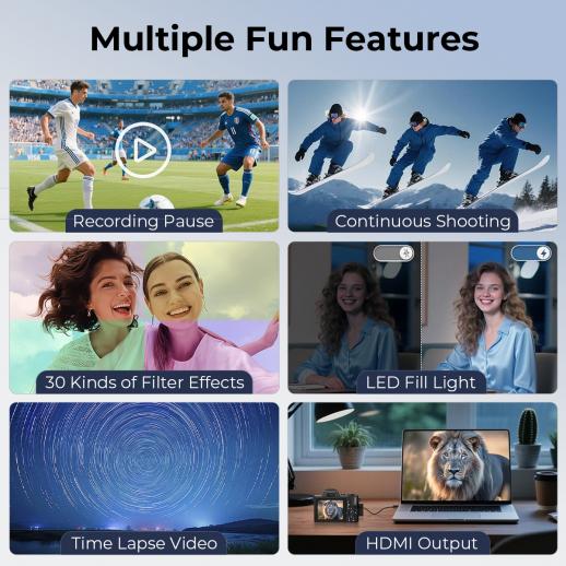 - Forreste eller bageste linser—dit skud, dit valg! Med dobbelte linser og en-knaps skift, er den 5K digitale rejsekamera nem at gå fra at tage selfies til at optage verden omkring dig. Den 4-tommers touchskærm gør alt glattere—juster indstillinger, forhåndsvis billeder, eller swipe gennem minder med blot en finger. Det er sjovt, hurtigt og lavet til skabere som dig.