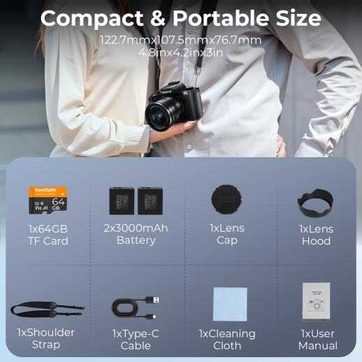 - * Flere Sjove Funktioner & Stor Kapacitetsbatteri: Kentfaith professionelt kamera til fotografering understøtter smilfange, 30 slags filtre, smukke ansigter osv. Den indbyggede blitzfunktion gør, at du stadig kan fange højkvalitetsbilleder selv under dårlige lysforhold. Inkluderer et 64GB SD-kort og 2x 3000mAh store kapacitetsbatterier, som giver mulighed for forlængede optagelser uden hyppig opladning.