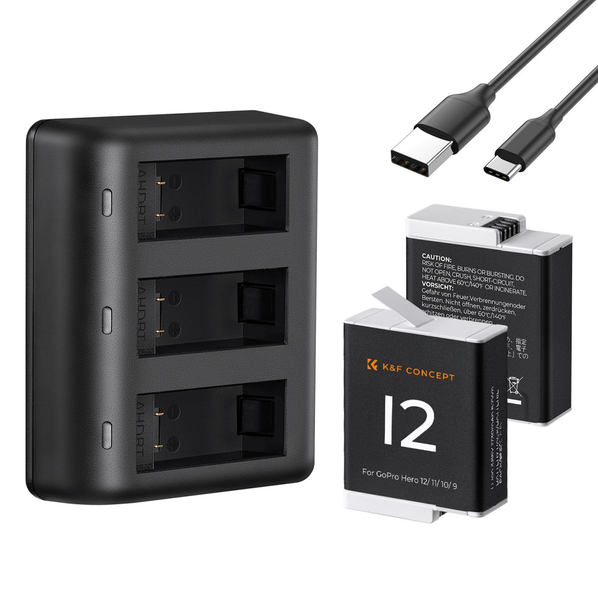 K&F Concept Gopro Hero 12/11/10/9 batteri, 3-kanals LCD USB hurtigoplader Passer til Gopro Hero 12 Black, Hero 11 Black, Hero 10 Black, Hero 9 Black