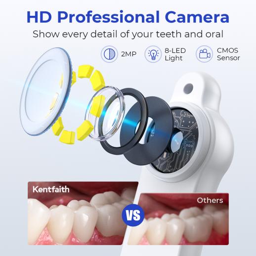 - * Med 2 MP HD-opløsning og 8 LED-lys giver dette smarte intraorale kamera og krystalklart billede af dine tænder og tandkød. Du kan også zoome ind for at få nærmere detaljer, nemt tjekke for små revner, plak ophobning, henfald i tænderne og madaffald – så du kan gribe ind, før mindre problemer bliver til store! (Fokusafstand: 5mm)