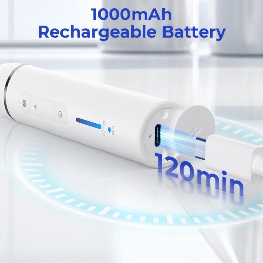 Takket være det genopladelige batteri på 1000 mAh kan du nyde op til 120 minutter kontinuerlig brug, hvilket giver dig masser af tid til at kontrollere hver tand og hvert hjørne, uden at du behøver at stoppe for en genopladning.