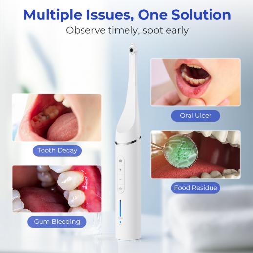 - * Vores alsidige intraorale kamera gør mere end blot at spotte hulrum – det hjælper med at registrere madsnavs, tandkødsproblemer, mundsår og endda giver dig mulighed for at tjekke halsen, hovedbunden eller huden. Perfekt til daglig tandpleje, holde øje med børns tænder, rengøre bøjler, støtte seniorer tandkødssundhed og endda hjælpe tandlæger med konsultationer