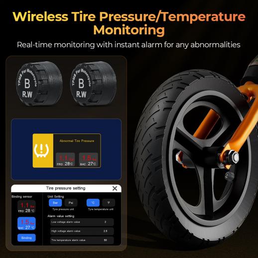 - * Udstyret med et dæktryks- og temperaturovervågningssystem holder det styr på dit motorcykeldæks helbred i realtid, og du får rettidige advarsler om eventuelle problemer, så du nemt kan køre (Bemærk: 2 sensorer medfølger). Og takket være G-sensoren udløses nødoptagelse ved pludselige kollisioner eller stød, hvilket sikrer, at kritiske øjeblikkelige fanges og bevares.