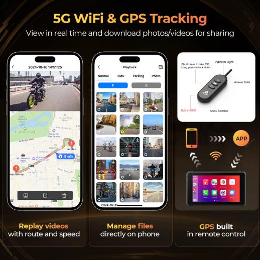 Med understøttelse af både Apple CarPlay og Android Auto kan du nemt tilslutte din telefon til motorcykel dashcameraet via Bluetooth for problemfri adgang til dine foretrukne apps og funktioner på Apple Carplay-skærmen. Ved hjælp af Siri eller Google Assistant kan du foretage håndfrie opkald, nyde musik, sende og modtage beskeder og navigere på kort.