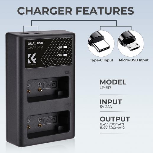 K&F CONCEPT LP-E17 dual-slot hurtigoplader med Micro USB og Type-C dual interface kompatibelt batteri til Canon EOS RP, Rebel T8i, T7i, T6i, T6s, SL2, SL3, EOS M3, M5, M6 Mark II, 77D, 200D, 750D, 760D, 800D, 8000D USB datakabel batterioplader