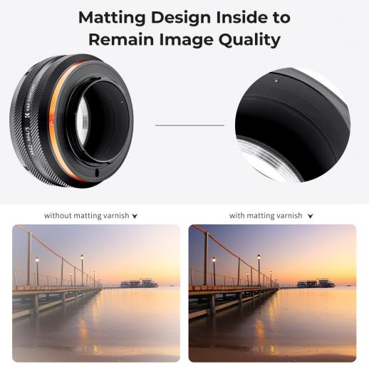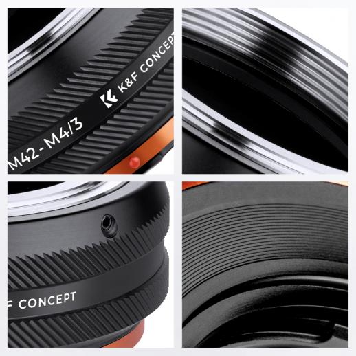 • K&F CONCEPT leverer omkring 300 typer objektivadapterringe, hvilket gør forskellige størrelser af objektiver og kameraer gnidningsfrit kompatible. Med et professionelt design og håndværk giver vores linseadapterringe fagfolk mulighed for at forny gamle linser. Det har aldrig været så nemt at holde forbindelsen til alle dine kraftfulde værktøjer.