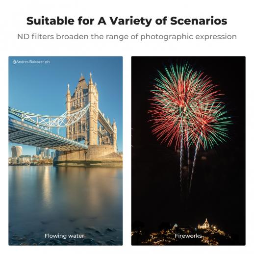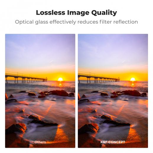 - * 【3 Stop】K&F Concept ND8 Filter giver en fast 3 f-stop lysreduktion, hvilket giver mulighed for lang eksponering og bevægelsesblur teknikker, perfekt til landskabsfotografering og filmiske effekter i videografi.