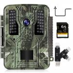 4K 32MP sporing jagtkamera, 100° vidvinkel bevægelsessensor udløst på 0,2 sekunder, 46 940nm svagt lys LED-lys, IP67 vandtæt, 2,31-tommer skærm med 64G SD-kort og hurtiginstallerede træpigge, multifunktionskortlæser kombination sæt
