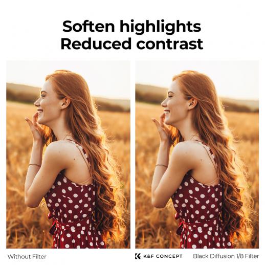 - * Importer optisk AGC Glass K&F Concept sort diffusion 1/8 filter Fremstillet af japansk AGC optisk glas, multibelægninger reducerer transmittansen til 87%, reducerer effektivt refleksion af filteroverfladen.
