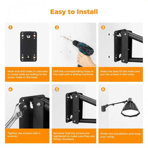 - * 【Sikker installation】Denne bomarm er fremstillet af holdbart, korrosionsbestandigt metal med en sort belægning og sikrer langvarig stabilitet. Brug de medfølgende 4 ekspansionsskruer til betonvægge eller de 8 selvskærende skruer til træ- og gipsvæginstallationer for sikker montering. Dette alsidige monteringssystem garanterer en fast og sikker opsætning på tværs af forskellige vægtyper.