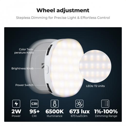- * 【Præcisionslys og trinløs styring】: Har et CCT-område på 3000K-6500K og en trinløs lysstyrke på 1-100%, alt sammen nemt at styre via et intuitivt fingerhjul. Med en CRI 95+-klassificering og en strålevinkel på 120° (240 lux @ 0,5 m) leverer den blød, naturlig belysning – perfekt til omgivelser med svagt lys og udendørsoptagelser om natten.