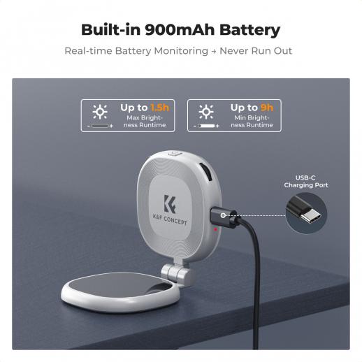 - * Lang batterilevetid og Type-C-opladning: Denne lygte er udstyret med et 900 mAh batteri og giver 1,5 til 9 timers driftstid afhængigt af indstillingerne. Den har en universel Type-C-port til praktisk opladning og en LED-strømindikator, der holder dig informeret om batteristatus, så du altid er klar til dit næste billede.