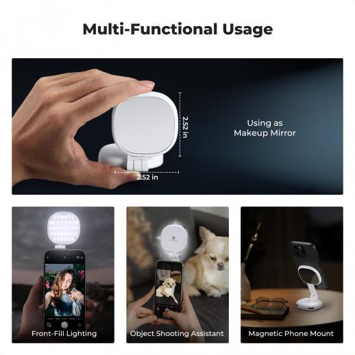K&F CONCEPT Magnetisk Telefon LED-lys: Sammenklappelig Selfie-lys med Makeupspejl, 3000K-6500K Dæmpbar Vlog-fyldlys til iPhone, Videoopkald og Makeup (Hvid)