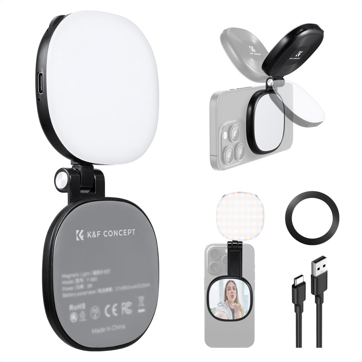 K&F CONCEPT Magnetisk Telefon LED-lys: Sammenklappelig Selfie-lys med Makeupspejl, 3000K-6500K Dæmpbar Vlog-fyldlys til iPhone, Videoopkald og Makeup (Sort)