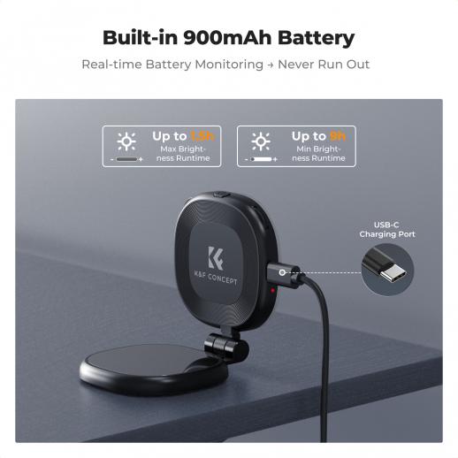 - * Lang batterilevetid og Type-C-opladning: Denne lygte er udstyret med et 900 mAh batteri og giver 1,5 til 9 timers driftstid afhængigt af indstillingerne. Den har en universel Type-C-port til praktisk opladning og en LED-strømindikator, der holder dig informeret om batteristatus, så du altid er klar til dit næste billede.