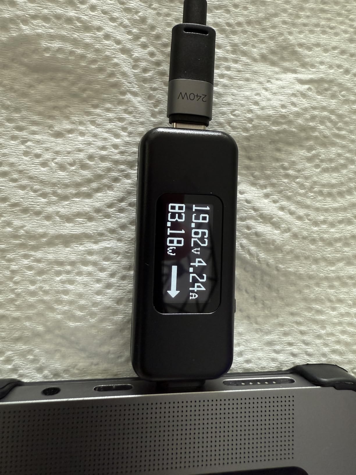 Dette er et fantastisk batteri, der pakker strøm, men vejer meget lidt. De mange porte er en bonus, med 2 D-TAP'er placeret på hver side, hvilket er en stor hjælp. Det har en ren finish med en LED-indikatorstribe, der vagt viser, hvor meget strøm der er tilbage. Det medfølgende K&F-kabel er klassificeret til 240W, og når jeg oplader en MacBook, fik jeg omkring 86W. Jeg skal bemærke, at hvis du oplader dette batteri, vil kablet trække så meget strøm som muligt fra murstenen eller væggen. Jeg oplevede, at hver ende af USB-kablet blev ret varm at røre ved, men kablet har en god fletning. Alt i alt meget imponeret, og det ville være en fair pris for et kraftfuldt batteri.